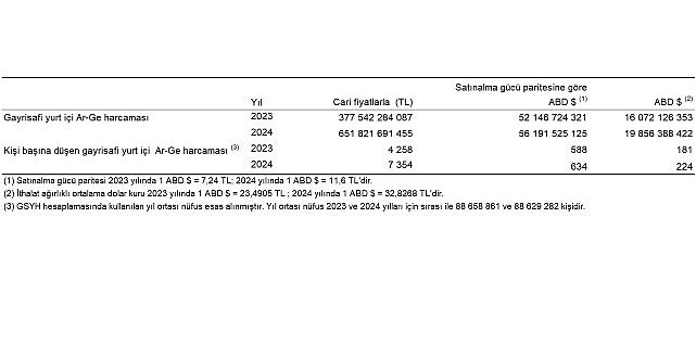 Gayrisafi yurt içi Ar-Ge harcaması 2024 yılında bir önceki yıla göre 274 milyar 279 milyon TL artarak 651 milyar 822 milyon TL’ye yükseldi.